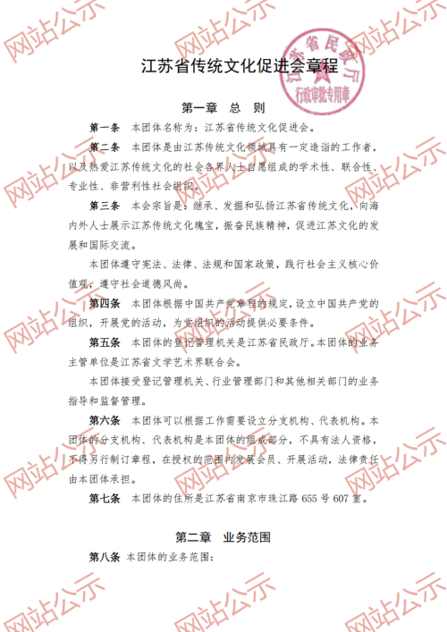 江苏省传统文化促进会是2014年5月3日经江苏省文学艺术界联合会苏文联民字[2014]3号文批准同意筹建,2014年9月5日江苏省民政厅苏社管[2014]100号文批准同意成立的省级一级社会团体。本会的宗旨是:继承、发掘和弘扬江苏省传统文化,向海内外人士展示江苏传统文化瑰宝,振奋民族精神,促进江苏文化的发展和国际交流。本团体遵守宪法、法律、法规和国家政策,践行社会主义核心价值观,遵守社会道德风尚。 本会业务范围:开展旨在于弘扬江苏传统文化的演出、展览、学术会议、咨询与培训等活动;组织开展各类的文化交流活动,促进海内外的文化艺术交流;宣传和普及传统文化,提高民族文化素质;资助传统文化事业,对发展江苏传统文化事业有突出贡献的会员和个人以及 学术著作和作品予以表彰和奖励;组织编发传统文化学术刊物、著作等。